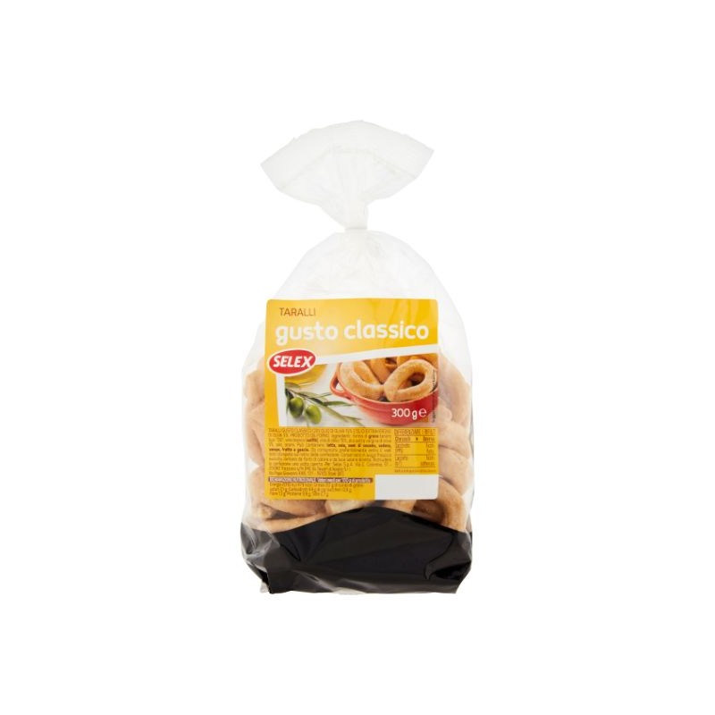 Taralli gusto classico con olio di oliva 15% e olio extravergine di oliva 5%. Prodotto da forno
