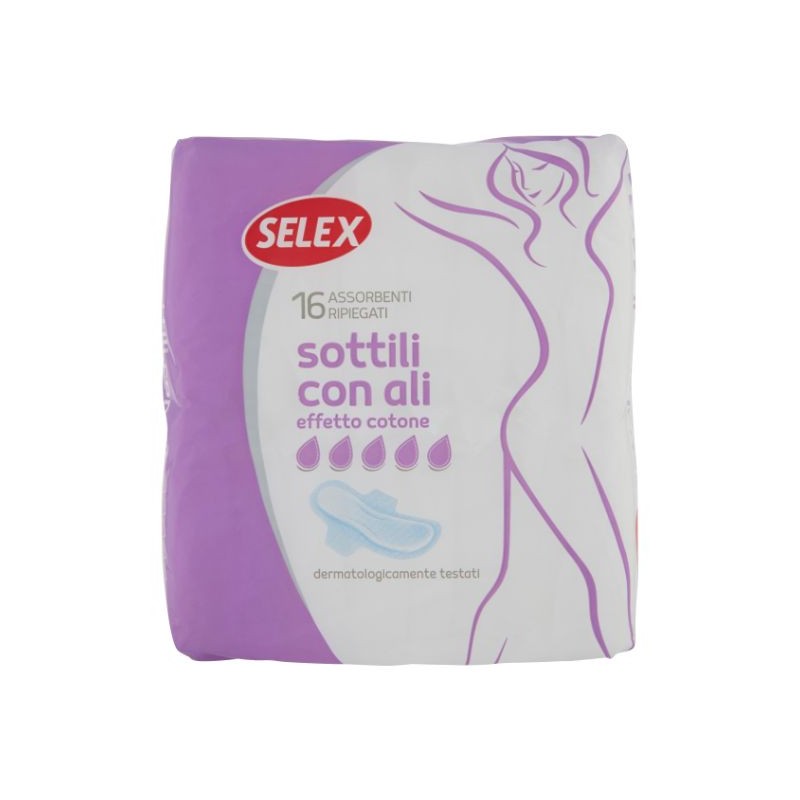 Selex Sottile con Ali per flussi normali e abbondanti è realizzato con una particolare miscela di cellulosa e materiale superassorbente, per una piacevole sensazione di asciutto.