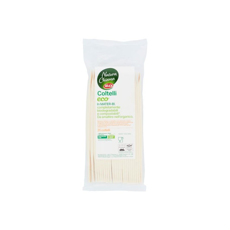 Coltelli eco In Mater-Bi, completamente biodegradabili e compostabili*. Da smaltire nell'organico. *UNI EN 13432:2002